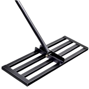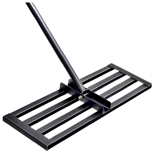 A lawn leveling rake is a specialized garden tool designed to create smooth, even surfaces on lawns by redistributing soil, sand, or topdressing material. It typically features a wide, flat metal head with closely spaced bars that glide easily over the ground. The long handle allows for comfortable use while standing, reducing strain on the back and arms. Ideal for repairing uneven patches, filling low spots, and promoting healthy grass growth, this rake ensures a professional-looking finish. It works efficiently on all types of turf and soil conditions. The sturdy construction provides durability and long-lasting performance. Perfect for homeowners and landscapers alike, it saves time compared to traditional rakes. A must-have tool for achieving a perfectly leveled and lush lawn.